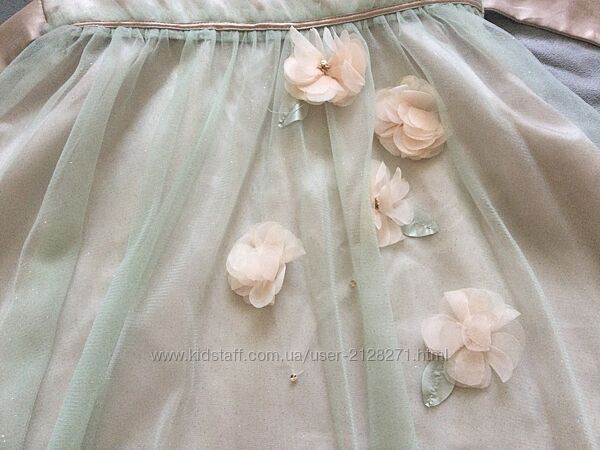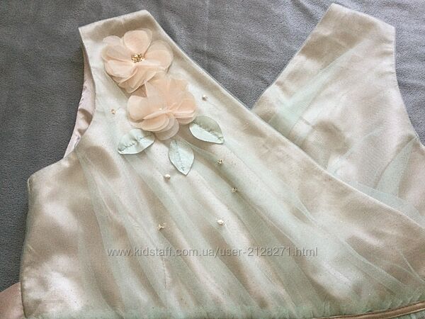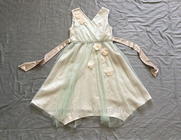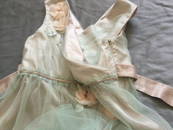 12-13 рок. Monsoon Дорога колекція. бірюзове з золотими блискітками. пишне, асиметричне. Чудово переливаються. прикрашене квітами у 3-D форматі. талія затягується величезним бантом. нове з бірками. довжина 90-98; пог 41; пот 36Другие объявления продавца