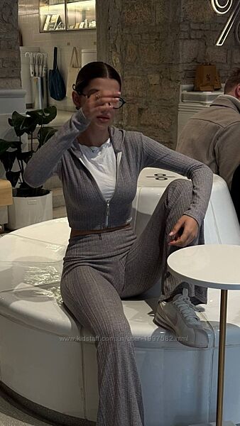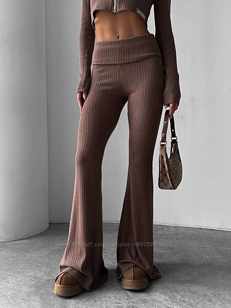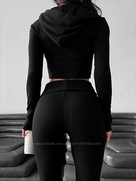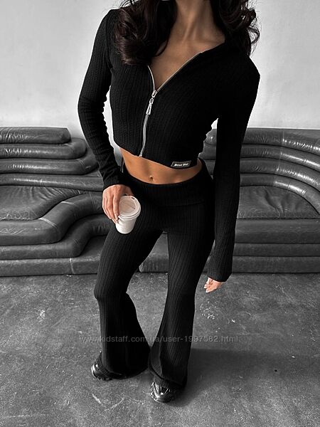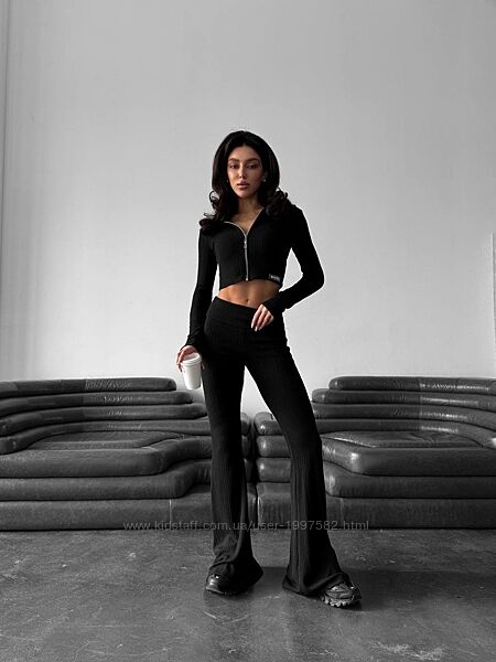 Комплект складається з укороченої кофти на блискавці з довгими рукавами та елегантних розкльошених штанів із високою посадкою. Матеріал приємний до тіла, еластичний, добре тягнеться та підкреслює фігуру.