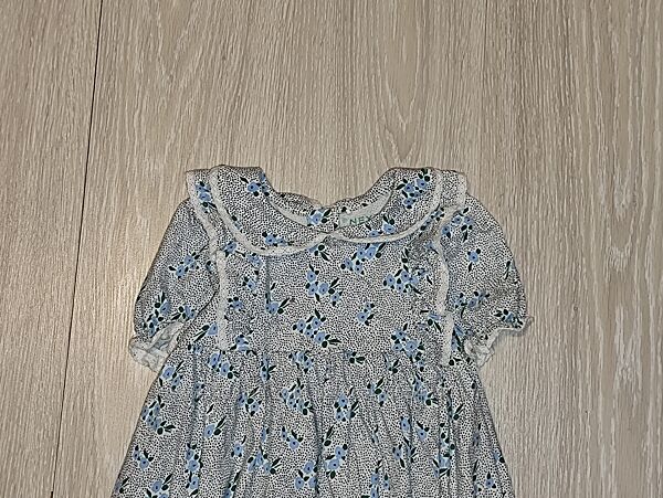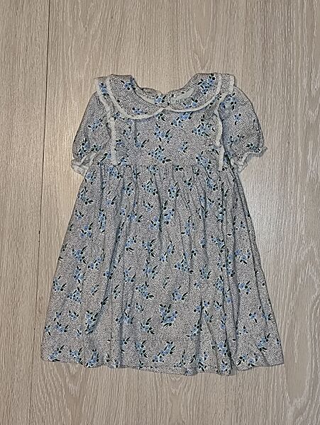 Фірмова блакитна сукня з короткими рукавами та коміром на 3-4 роки. На спинці застібається на ґудзики.Тканина 100% бавовна Стан відміннийЗаміри: довжина по спинці від плеча 58 см, ширина між пахвами 31 см, плечі 26,5 см
