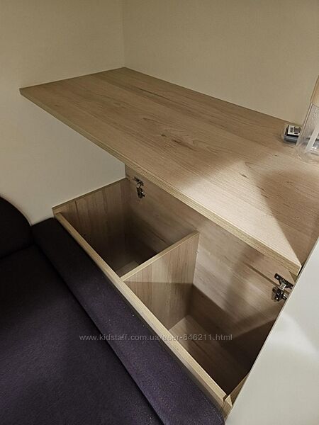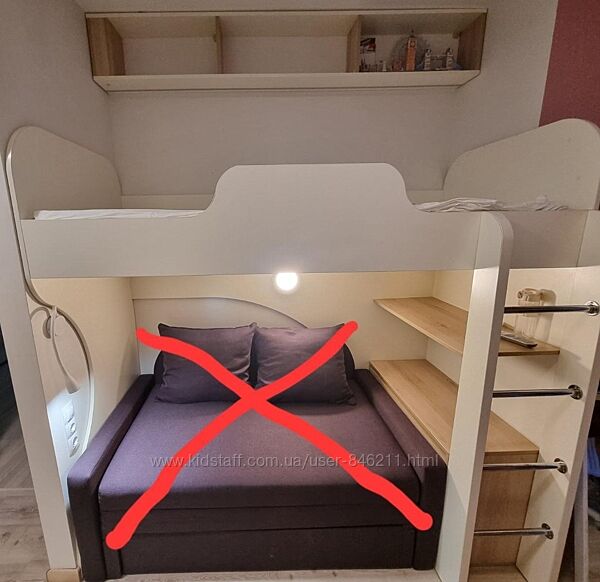 У нас внизу був розкладний диван (на фото, але не продається) і шафка/сундук для зберігання речей, іграшок, поверхня якого слугувала як поличка біля нижнього спального місця (якщо ставитиме вниз ліжко, то можна без сундука).