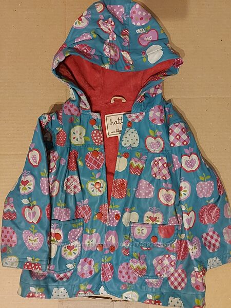 3. Барвиста куртка-плащ дощовик на утеплювачі. Є затертості і верхній водовідштовхувальний шар якийсь липкуватий на дотик, але з дощем справлявся. Hatley.