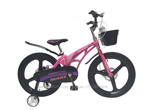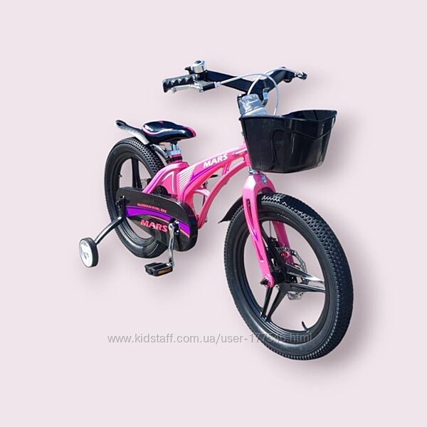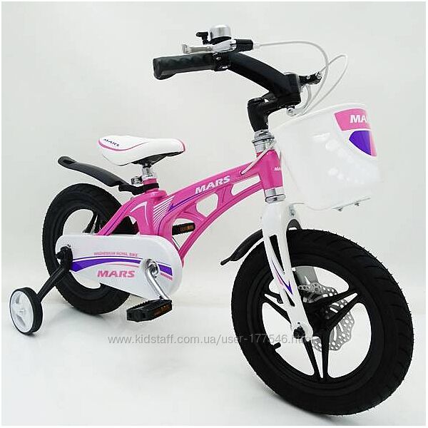 Магнієвий велосипед MARS оснащений переднім та заднім дисковими гальмами. До комплектації також входять: передній кошик, дзвіночок, переднє та заднє пластикові крила, підніжка та додаткові тренувальні колеса. Зручне регулювання сидіння дозволить користуватися велосипедом протягом кількох років.Двоколісний велосипед «MARS» – це дуже стильний та яскравий транспорт. Він розроблений з урахуванням останніх тенденцій та інновацій у виробництві дитячих велосипедів. Модель має посилену раму, міцні диски та колеса з гарною амортизацією. У велосипеді можна регулювати висоту керма та сидіння, а наявність додаткових коліс допоможе дитині швидше навчитися кататися та утримувати рівновагу.