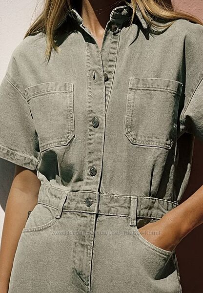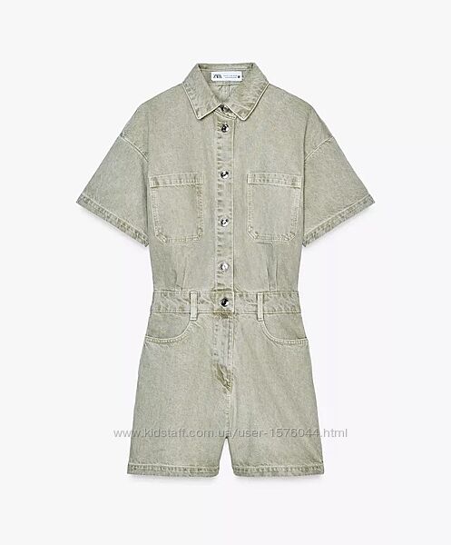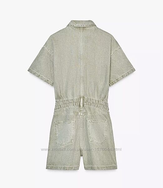 Комбинезон с воротником и короткими рукавами. Передние карманы и накладные карманы сзади. Эластичная талия сзади. Застёжка на молнию и металлическую пуговицу спереди.
