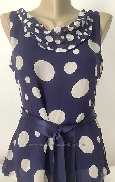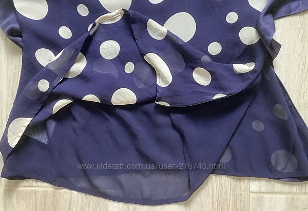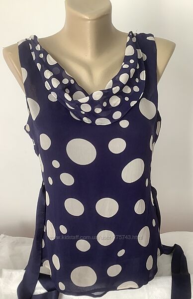 Блузка производство Ted Baker ,London. Размер английский 4,идёт на 46-48 украинский.Блузка приталенная, на подкладке, верх-100% шелк, подкладка -полиэстер.Низ блузки на молнии 22 см в боковом шве. Воротничок хомут,шелковая ткань красиво падает на блузку. Пояс шириной 5 см, длина 156 см.Замеры длина 69 см,ширина под проймой 47 см,по талии 41 см,ширина низа 52 см,боковой шов 37см.