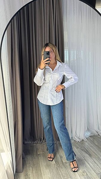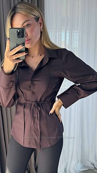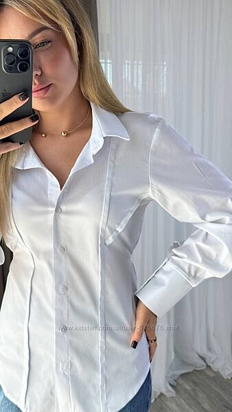 Сорочка приталена, позаду є мотузки, які можна завʼязати та підкреслити лінію талії, рукав на широкому манжеті, застібається на два ґудзика, рукав вільний