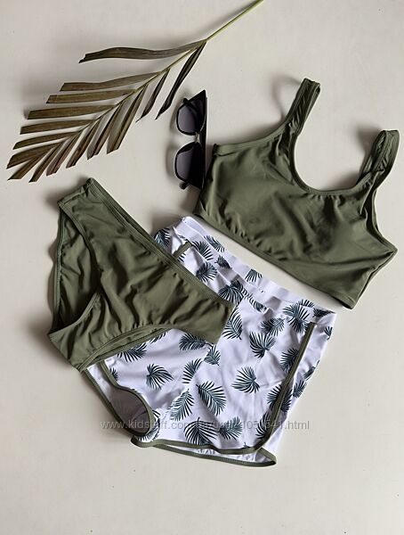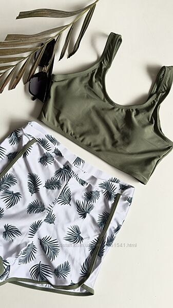 Роздільні купальники зеленого хакі кольору Х2 - з принтом білих візерунків листочкиВерх топ - з підкладкою попереду і чашечками , на широких бретельках, низ - плавки бікіні , в комплекті спортивні шорти