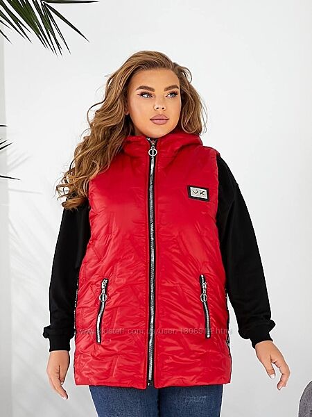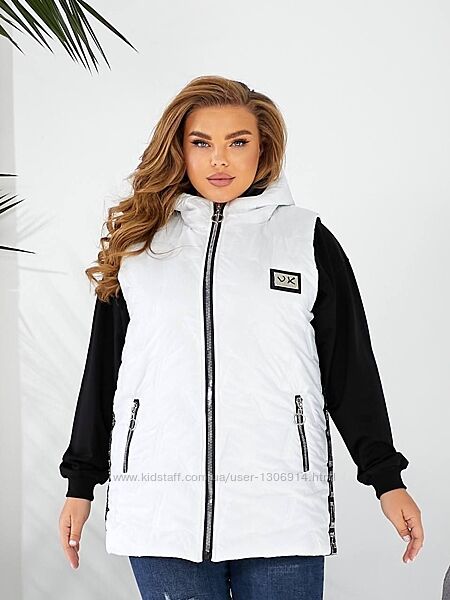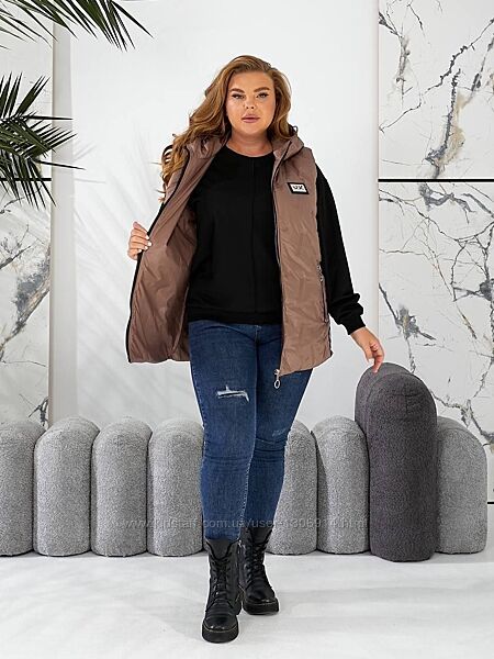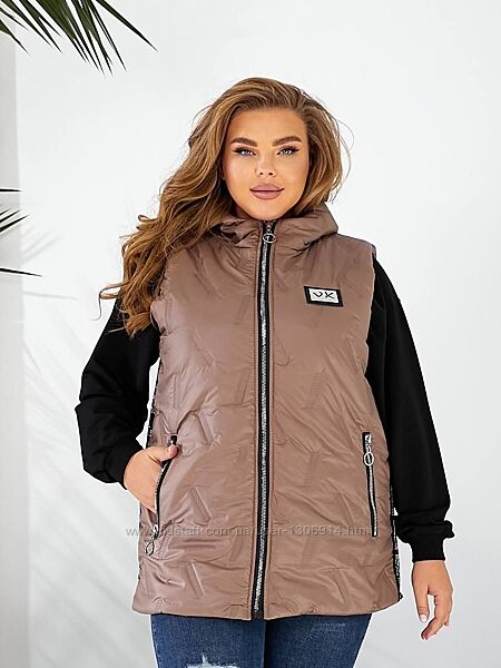 Стильна жилетка прямого крою з кишенями на змійці, зручний глибокий капюшон, декорована лампасами з камінням, якісна фурнітура.