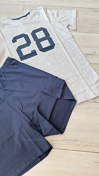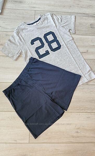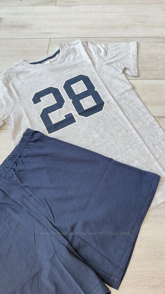 Комплект шортама від H&M на хлопчиків юніорів , з м,якого трикотажу , футболка з принтом 28 попереду і шортами- мають еластичную талію на резинціРІСТ 146-152 ( футболка довжна 60 ПОГ 42 , шорти талія- 32 довжина 40 см ) 158-164 ( футболка довжна 64 ширина 47 , шорти талія- 34 довжина 45 см )
