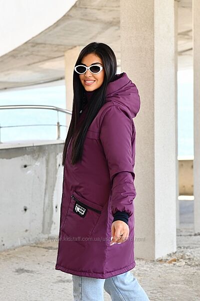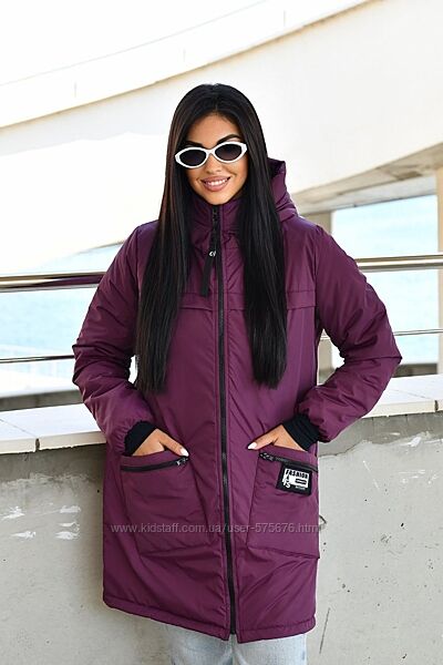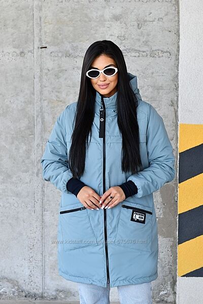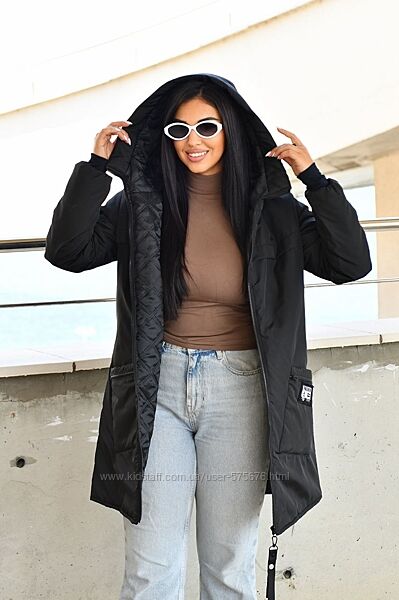 Демісезонне пальто на синтепоні. Виріб вільного силуету, має дві оздобленні кишені з обох боків, з капюшоном, передня застібка на блискавці, в рукаві манжет на флісі, усі карабіни «Фешн» з’ємні