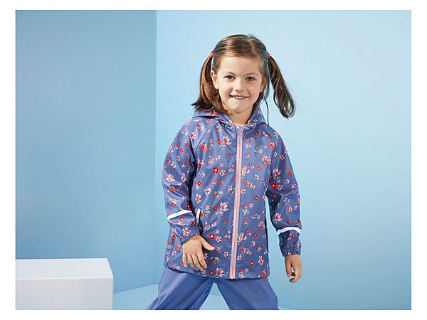 Куртка-дощовик для маленької модниці бренду Lupilu (Німеччина). У такому одязі не страшний дощ! Завдяки сучасній екологічній технології Bionic Finish Eco має вітрозахисні, водонепроникні та дихаючі властивості, а також брудовідштовхувальне покриття тканини. Не потребує прання, достатньо протерти вологою губкою. Застібається на блискавку із захистом підборіддя. З боків дві кишені. Рукави на гумці, для захисту від вітру та дощу. Щільна тканина з пропаяними швами. Глибокий каптур. Світловідбивачі на кишенях, рукавах, спині.Заміри: надаємо по запиту