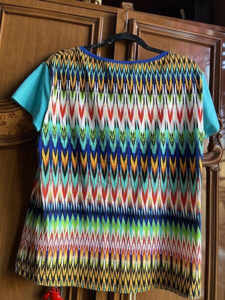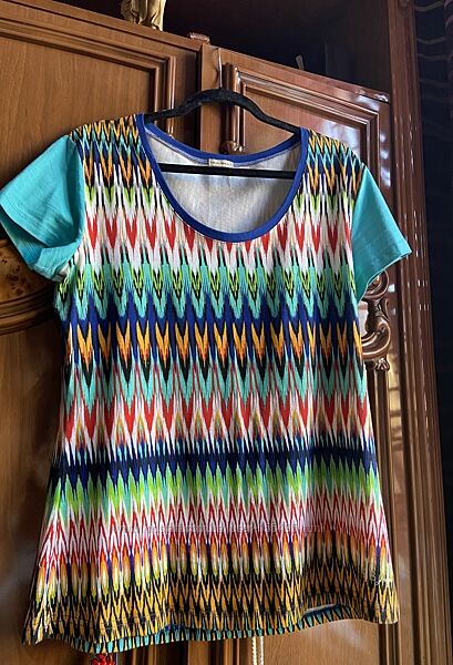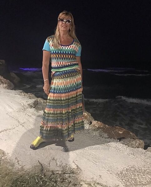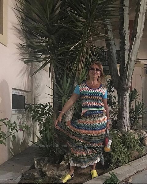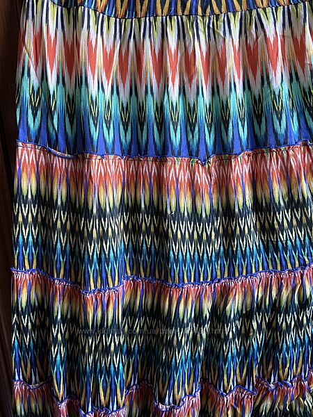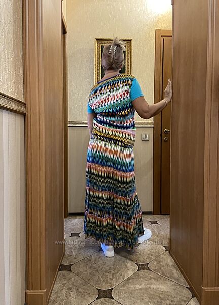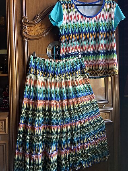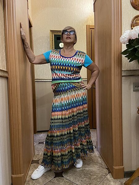 Яркий летний натуральный костюм: ярусная юбка в пол и футболка. Юбка свободная, легкая и летящая из 100% вискозы. На подкладке. Сзади молния. Футболка прямого силуэта из 100% хлопка.Размер L (46-48)