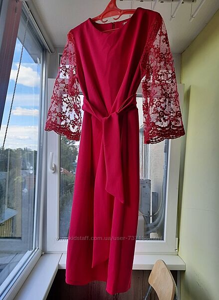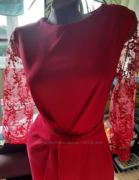 Плаття Angelina, 100 % віскоза, розмір М. Колір піона, ближче до рожевого. Сзаду прихована молнія до поясу, є пояс. Рукава з мережива.Заміри: довжина 103 см, ПОГ 48 ( і ще буде місце), ПОТ 42 см ( тягнеться ще), ПОБ 51-52 см, плечі 38 см, рукав 45 см.