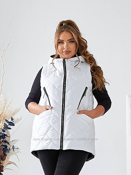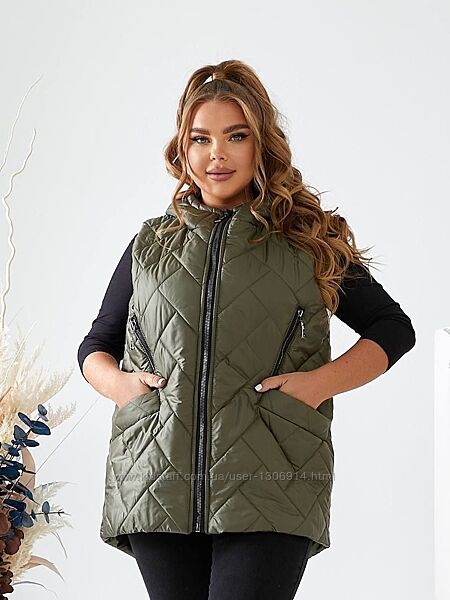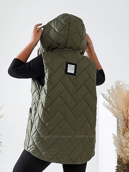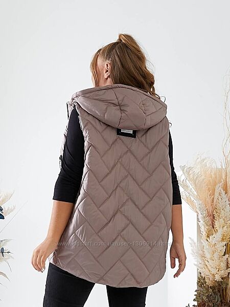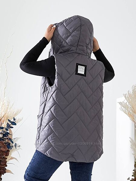 Стильна стегана жилетка з кишенями, зручний глибокий капюшон, якісна фурнітура.