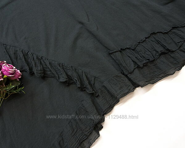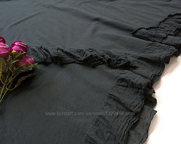 Крой свободный, расклешенная книзу, выполнена из плотного трикотажа двунитка, декорирована ассиметричными оборками из жатой хлопковой ткани. Вещь универсальная, классно смотрится на любом типе фигуры, легко сочетается с любым низом.