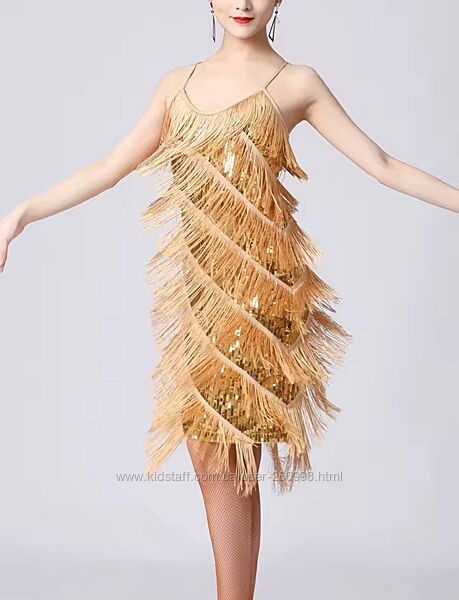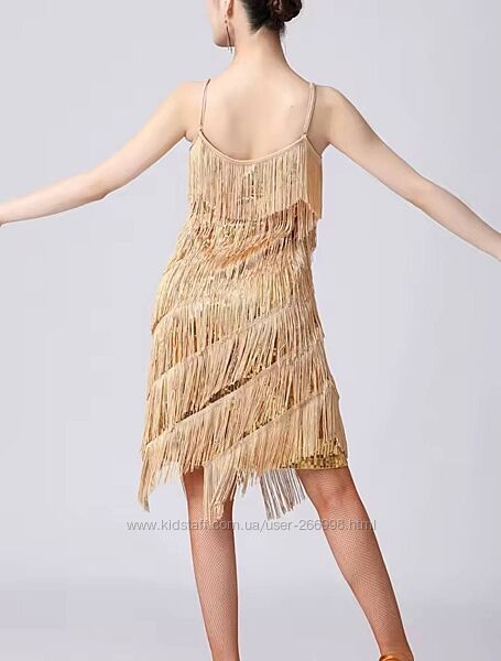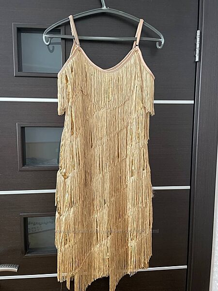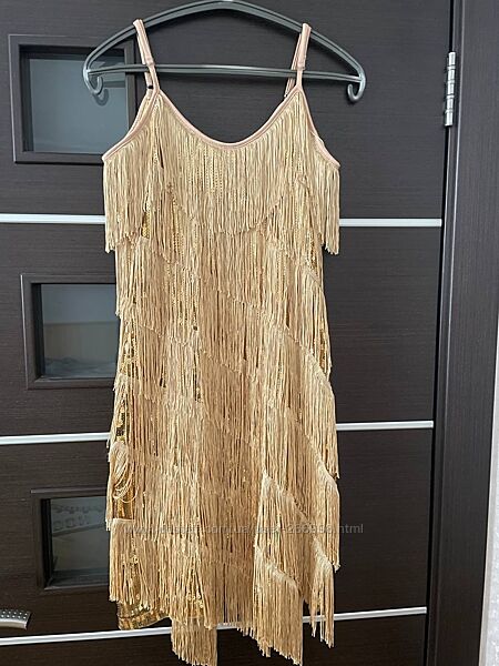 Яркое золотое непрозрачное платье для латины/на вечер. Размер М. Рост 168-175см. Цвет - золото, бахрома, пайетки. Не прозрачное, есть подкладка. Тяжелое и не задирается. Длина 90-100см (шлейки регулируются), талия 72-76см, ПО в груди - 45см (стрейч, на 2-3 размер). Новое.