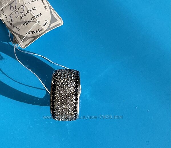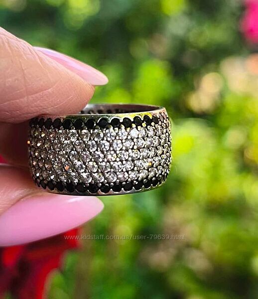 Подробное описание: Срібна широка жіноча каблучка з білими і чорними фіанітами