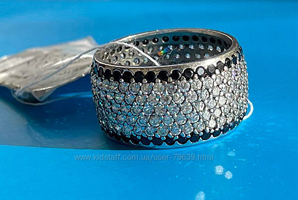 Срібна широка жіноча каблучка з білими і чорними фіанітами.Родоване срібло 925 проби, бірка, пломба.