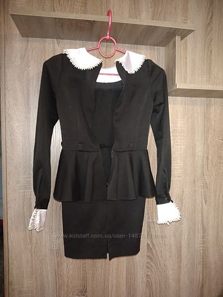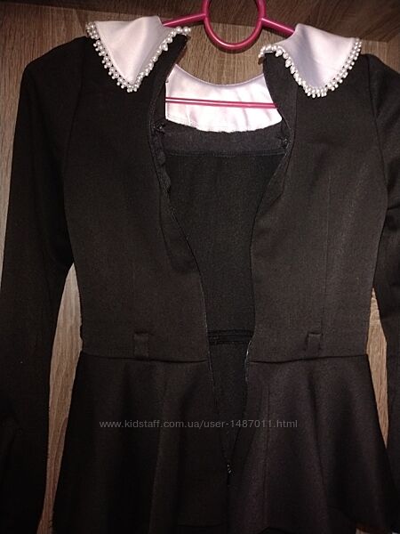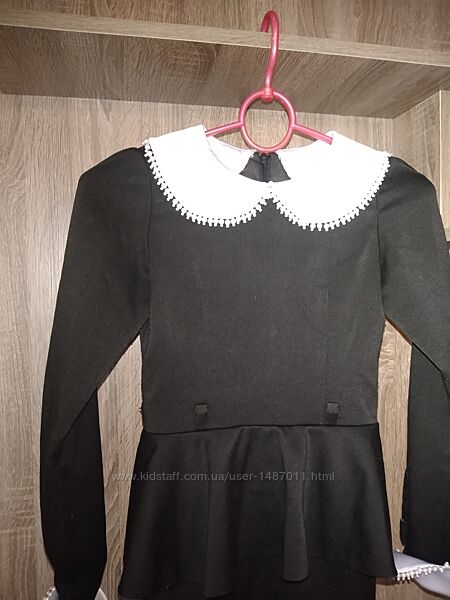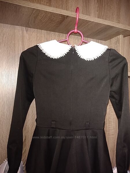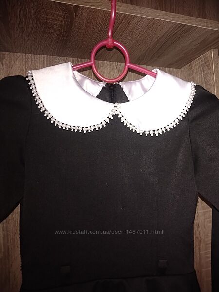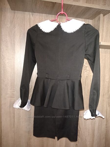 Платье школьное форменное для девочки. Возраст 7 - 8 лет, рост 128см. Цвет чёрный, с белыми воротником и манжетами. Платье в классическом стиле: прямой силуэт, отрезное по линии талии, с длинным рукавом, оборкой по линии талии, сзади - небольшой разрез. Сзади- по всей длине спины "молния", для хорошего облегания по фигуре. Ткань - мягкая, плотная; не мнётся и не требует утюжки.Длина 72см, окружность груди 62см, окружность талии 56см, окружность бёдер 67см, длина рукава 50см.