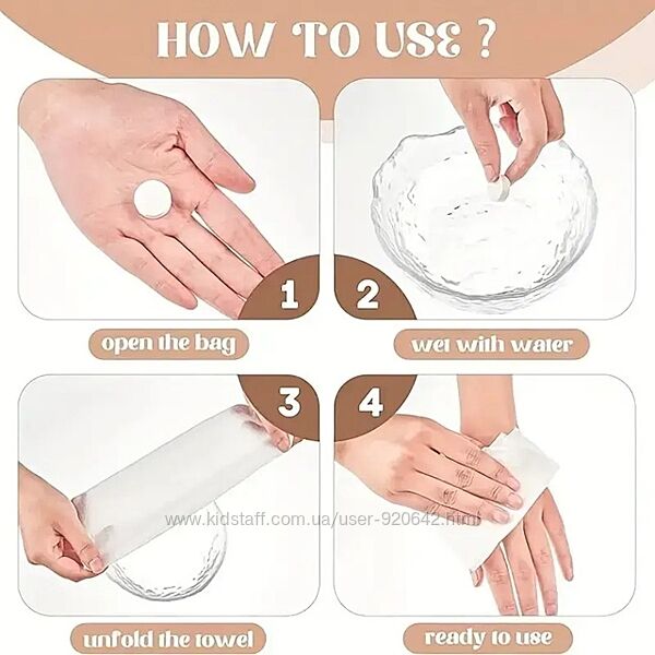 Пресовані мінісерветки в таблетках на 100 % складаються з натуральної бавовни, виготовлені з екологічно чистого матеріалу та підходять для всіх типів шкіри. Вони гіпоалергенні та стерильні, прості у використанні, економічніші та практичніші за звичайні махрові серветки.Їх дуже легко транспортувати, зберігати та використовувати: достатньо кількох крапель води (гарячої, холодної або ароматизованої), щоб отримати повноцінну вологу серветку.