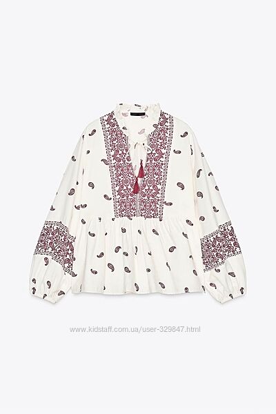 ZARA.У наявності блуза жіноча. Блузка з коміром-рюшами та куліскою з помпонами. V-подібний виріз та довгі рукави на гумці. Застібається спереду на ґудзики, обтягнуті тією ж тканиною. Склад тканини 83% віскоза, 17% поліамідРозміри S та M