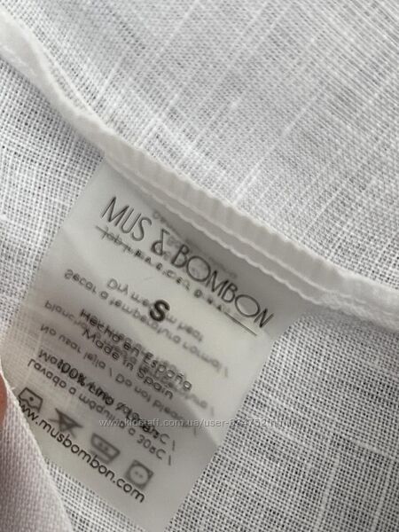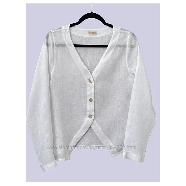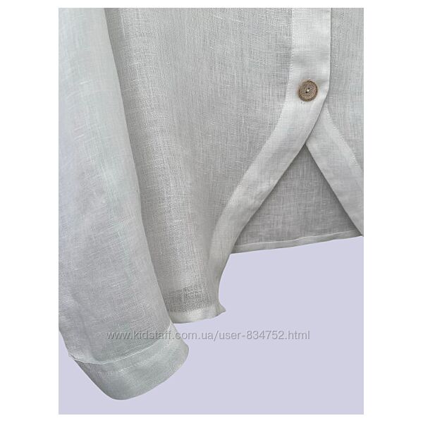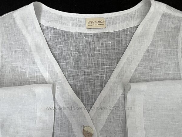 Белая льняная блуза рубашка без воротника Mus&Bombon/BarselonaРазмер S, на 44. Ширина в груди 51, по низу 58, плечи 37, длина 60/64, длина рукава 62, от горловины 71. На фото модель Огр 95
