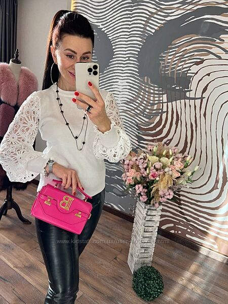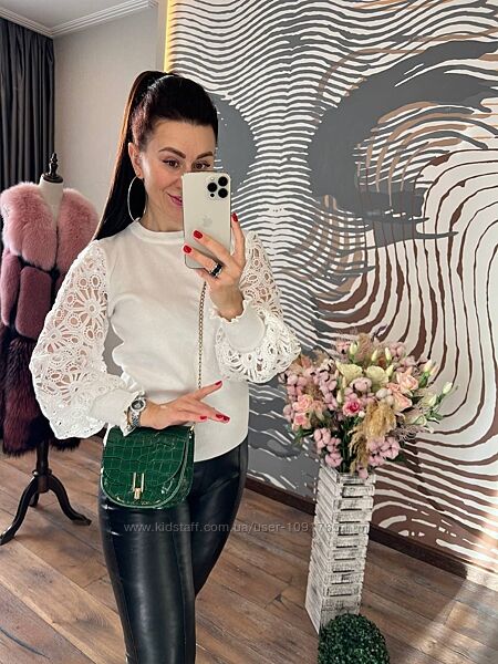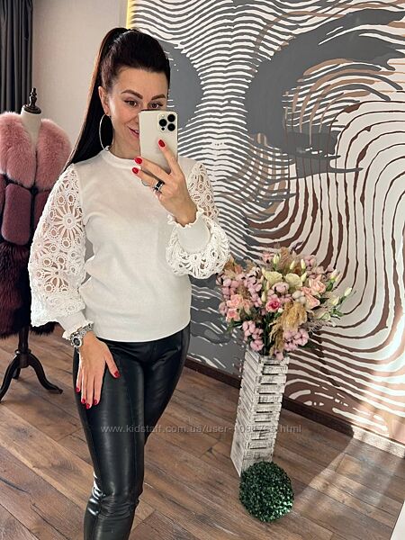 яскрава, стильна і комфортна кофта вільного крою з круглим коміром, на гумці внизу і високих манжетах, шикарними рукавами з приголомшливо гарного мережива на підкладці з прозорої сітки, виготовлена з приємного до тіла трикотажу дрібної машинної в´язкикофточка має чудовий вигляд на дівчатах з різними типами фігури, в ній затишно і легко, вона створить чудовий настрій і займе гідне місце у вашому гардеробі