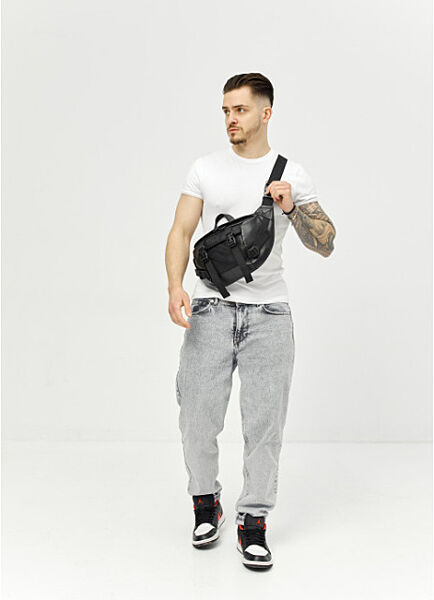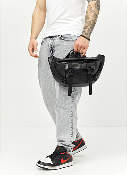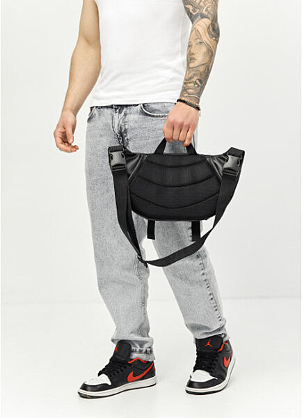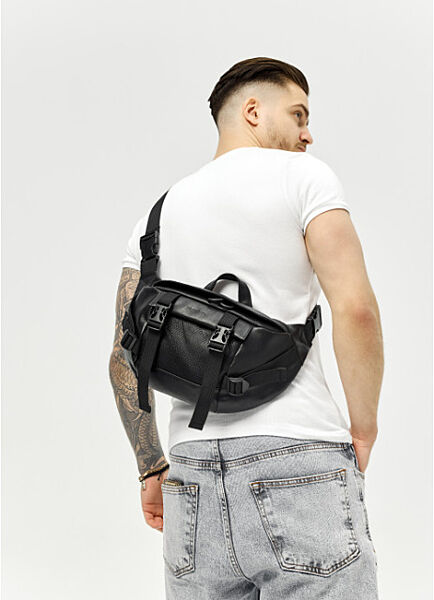 Велика шкіряна чоловіча поясна сумка бананка чорна