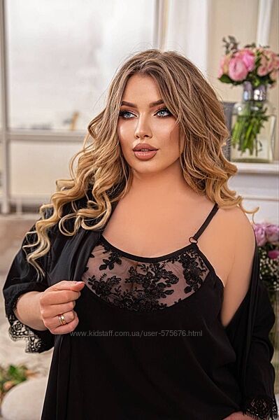 58-60 Об´єм грудей - 124 см, Довжина майки - 55 см, Об´єм талії - 92 см (розтягується 134 см), Об´єм стегон - 148 см Довжина шорт - 34 смДовжина халата - 82 см, Довжина рукава халата - 32 см