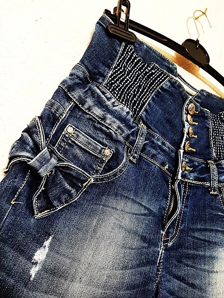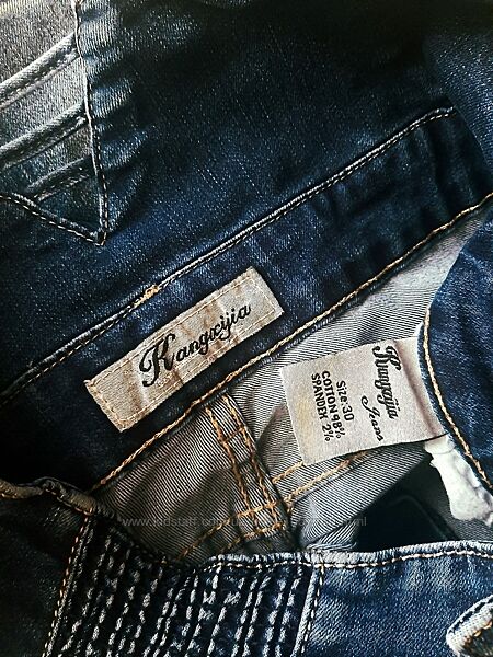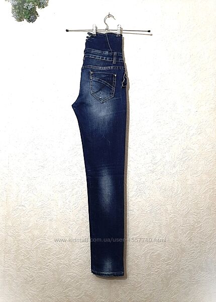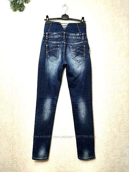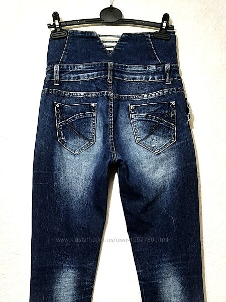 Джинси жіночі сині, звужені донизу, висока посадка, по боках резинка.Бренд Kangxijia. Маркування розміру 30. Склад 98% котон, 2% спандекс.