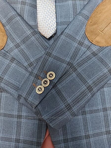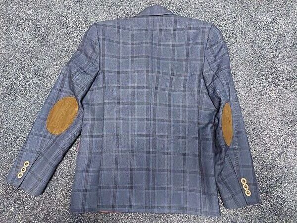 На підкладі, приталений, на два гудзики,однобортний, з двома шліцами, кишені "в рамку" акуратними клапанами, з коричньовими налокотниками.