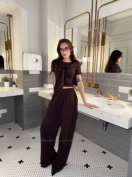 Стильна базова трійка з палаццо для весняних та літніх прогулянок: ідеальний крій, базові кольори та натуральна «дихаюча» тканина. Футболка скімс, штани палаццо вільного крою та лонгслів з вирізами для пальчиків