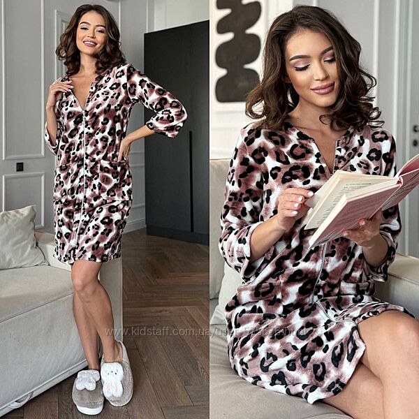 Особливості: халат з прямим кроєм, дві кишені, застібається на блискавку по центру — ідеальний варіант для комфортного та стильного вигляду.