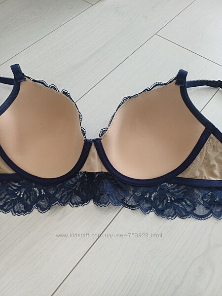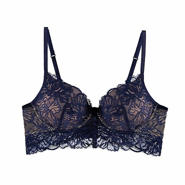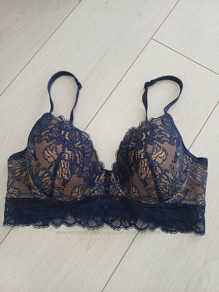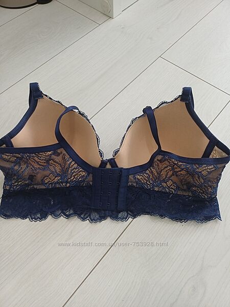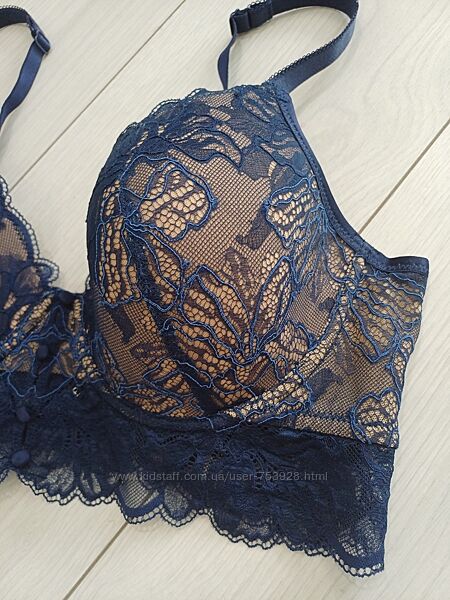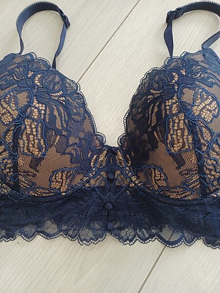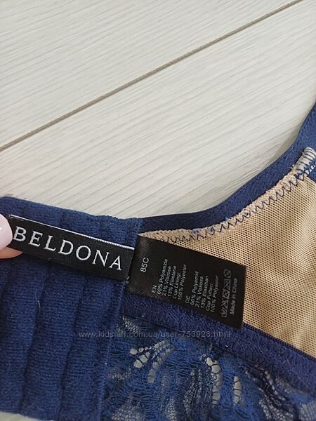 У продажу бюстгальтер від швейцарського бренду білизни Beldona, модель Kora. Подовжений бюстгальтер синього кольору, формована чашка накісточках та тонкому поролоні, бежевого кольору в основі, спереду