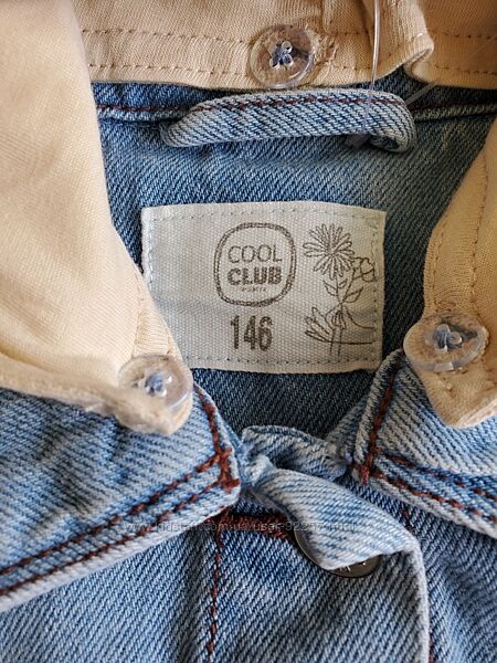 Продам модну джинсову куртку з капюшоном Відмінна якість та стиль Підходить для весни та осені Ідеально для активних дівчат, які люблять модний одяг Розмір: 146 ПОГ-41, рукав від плеча-62, від шва-53, плечі-32,5, довжина-48, ширина внизу-39 Бренд: Cool Club Матеріал: Джинс, капюшон з легкої тканини Стильний дизайн з капюшоном, дві передні кишені на кнопках, якісна фурнітура з логотипом "Cool Girl Club"