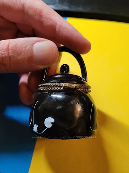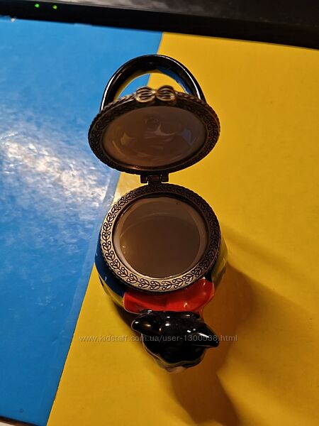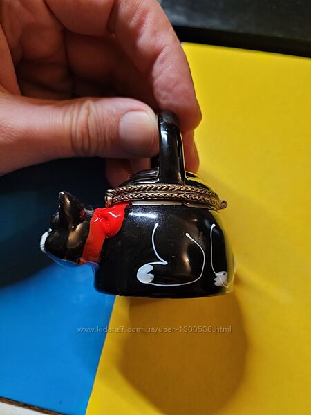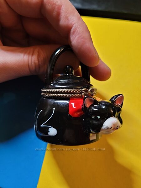 Кот-шкатулка из керамики.Механизм открытия-закрытия металлический. Держит плотно, не открывается.Диаметр - 5смВысота шкатулки 3смВысота с ручкой - 6смВ стоимость входит доставка Новой почтой или Укрпочтой
