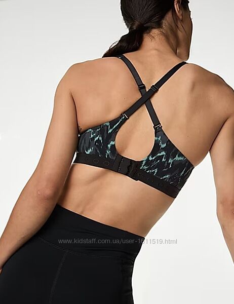 Спортивний бюстгальтер від англійського бренду Marks & Spencer. Чашки ущільнені, з підкладкою з дихаючої тканини, на кісточках. Бретелі з м´якою підкладкою, по спинці знімні, регулюються. Можлива відсутність паперової бірки.(12461)