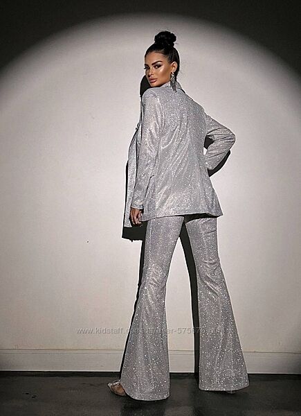 Вечірній костюм блискучий з люрексу піджак з штанами кльош топ з чашечками