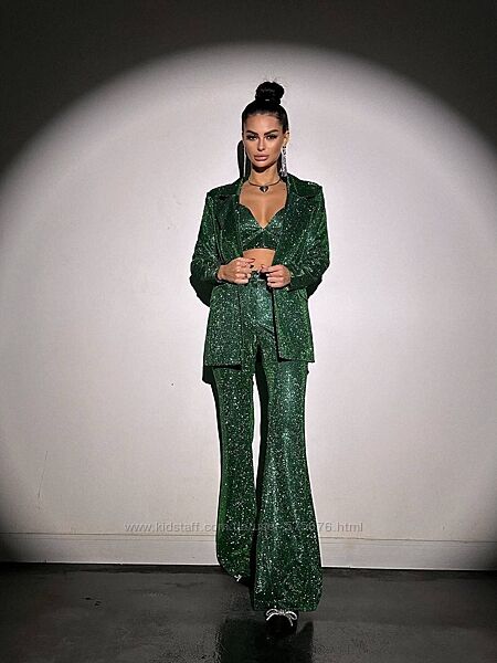 Подробное описание: Вечірній костюм блискучий з люрексу піджак з штанами кльош топ з чашечками