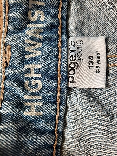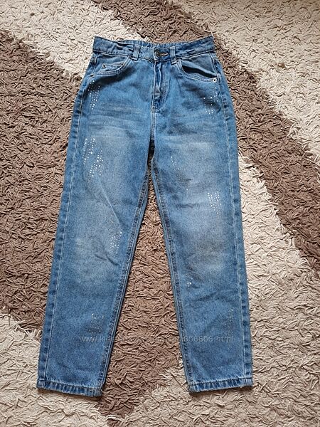 Джинси для дівчаток німецького бренду Pageone у стилі ´мом´, розмір 134, колір синій, виготовлені з деніму зі стразами. Відмінний стан. Заміри: довжина 80см, шаг 56см, посадка спереду 25см, пояс 30см (не тягнеться, але можно зробити менше за допомогою резинки)