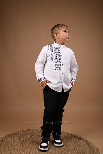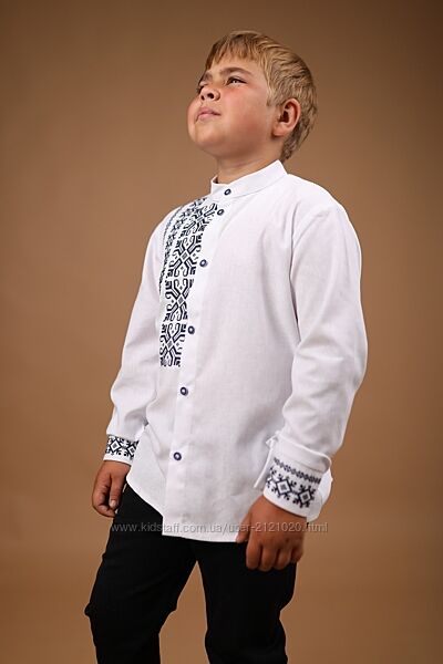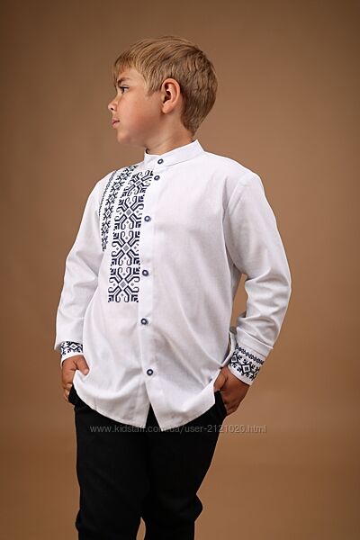 Подробное описание: Вишиванка біла для хлопчика з синім орнаментом шкільна на ґудзиках