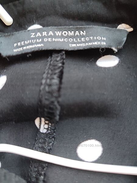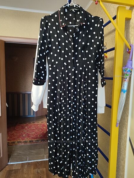 Легка струмка сукня в горох від Zara. Вказано M, краще буде на S. Рукав 3/4. Дуже гарний стан.Довжина 115, рукав 45, пог 44, пот 36, поб 56