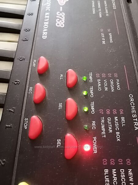 Синтезатор в рабочем состоянии, некоторые белые клавиши не работают, верхняя панель рабочаяРаботает от сети и батареек
