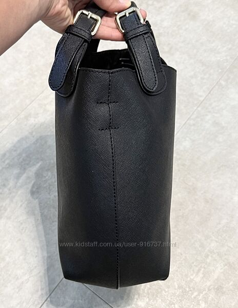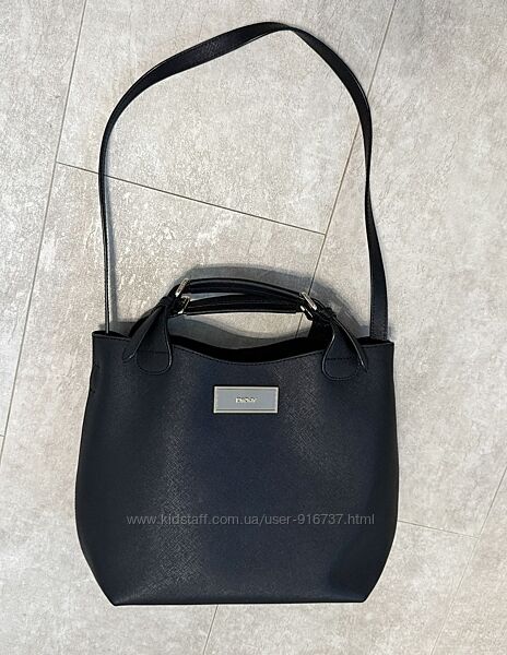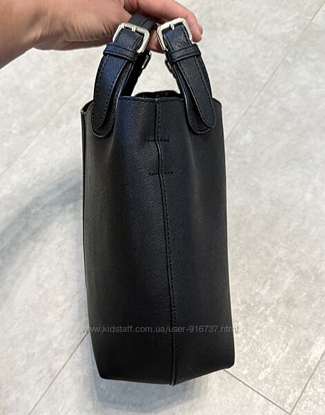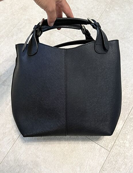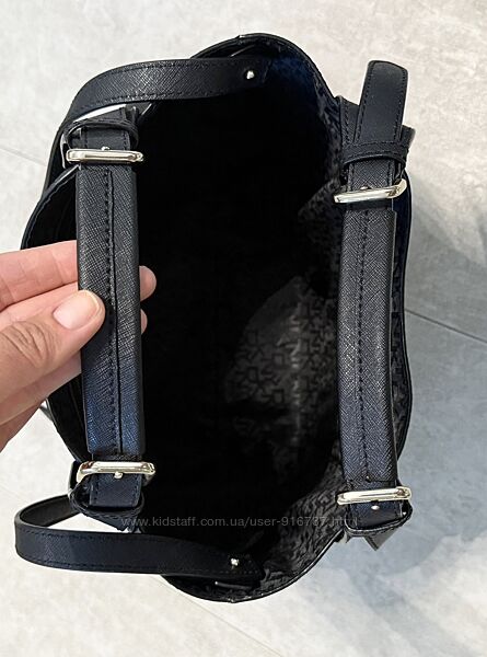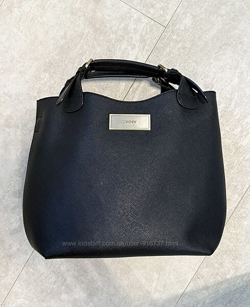 Шкіряна сумка DKNY, оригінал. Натуральная зносостійка шкіра саф´яно. Стан нової, майже не носили, ніяких слідів використання. Довжина реміня 76 см, відстібається. Всередині текстильна сумочка на блискавці, кріпиться до сумки кнопками. Також всередині три кишені, одна з яких на блискавці. Висота посередині 24 см, збоку- 27 см. Довжина 32 см, ширина 14 см.