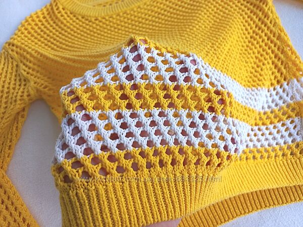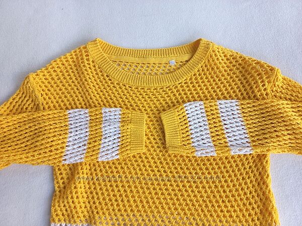 Пропоную жовтий легкий ажурний светр. Матеріал 100% акріл, тягнеться. Уживаний акуратно, стан відмінний, дивіться фото.Довжина 52 см, рукав від шиї 68 см, ширина грудей під пахвами 50-56 см.