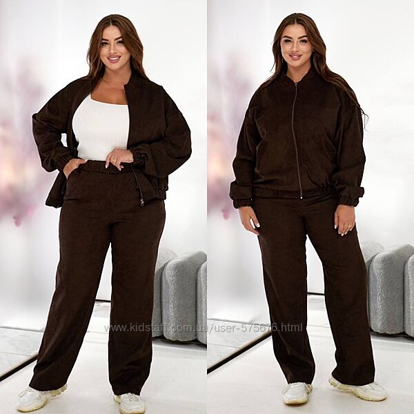 Костюм вельвет бомбер + штани. Бомбер на блискавці, знизу на резинці, довгий рукав на резинці, із кишенями. Штани прямого крою високої посадки, із кишенями,талія на резинці.