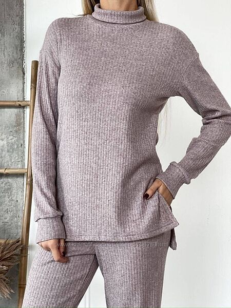 Светр під горло з бічними розрізами, прямі штани з кишенями – комфорт та жіночність в одному комплекті.