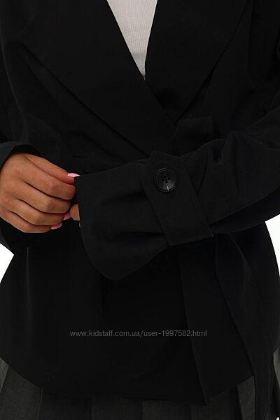 Має широкі відкладні лацкани,зручні кишені та застібку на ґудзики. Рукави доповнені ремінцями з ґудзиками, що дозволяють регулювати їхній об’єм. Легка oversize-посадка додає тренду та комфорту, а універсальний крій поєднується як з класичними образами, так і з повсякденними луками.