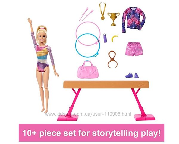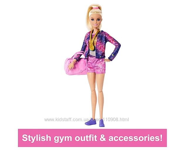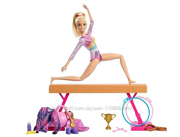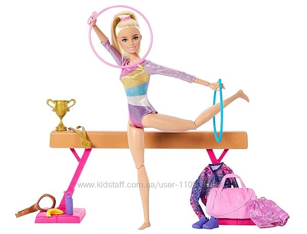 Барби гімнастка з аксесуарами.У комплекті: лялька лялька Barbie у райдужному купальнику, гімнастична колода, 2 обручі, 2 булави, затискач, спортивний костюм, взуття, перекус, спортивна сумка, кубок, медаль.