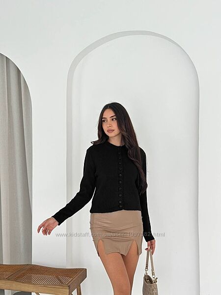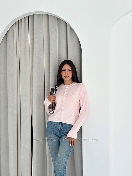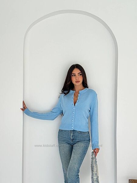 Базовий укорочений кардиган. Модель із довгим рукавом та круглим вирізом. Застібається на гудзики. Фото реал