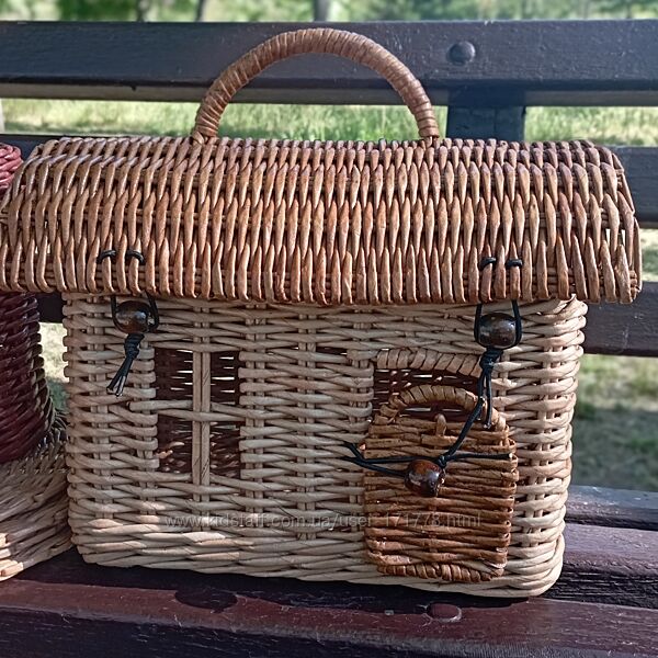 Плетений будиночок кошик розміром по дну 15х25 см. З таким саквояжем можна піти на прогулянку, поклавши все необхідне для прогулянки. А можна зберігати там іграшки або використовувати як скриньку. Ручна робота, всі матеріали без запаху на водній основі. Будиночок не боїться води, при забрудненні можна протерти вологою серветкою.Предложения Premium магазинов